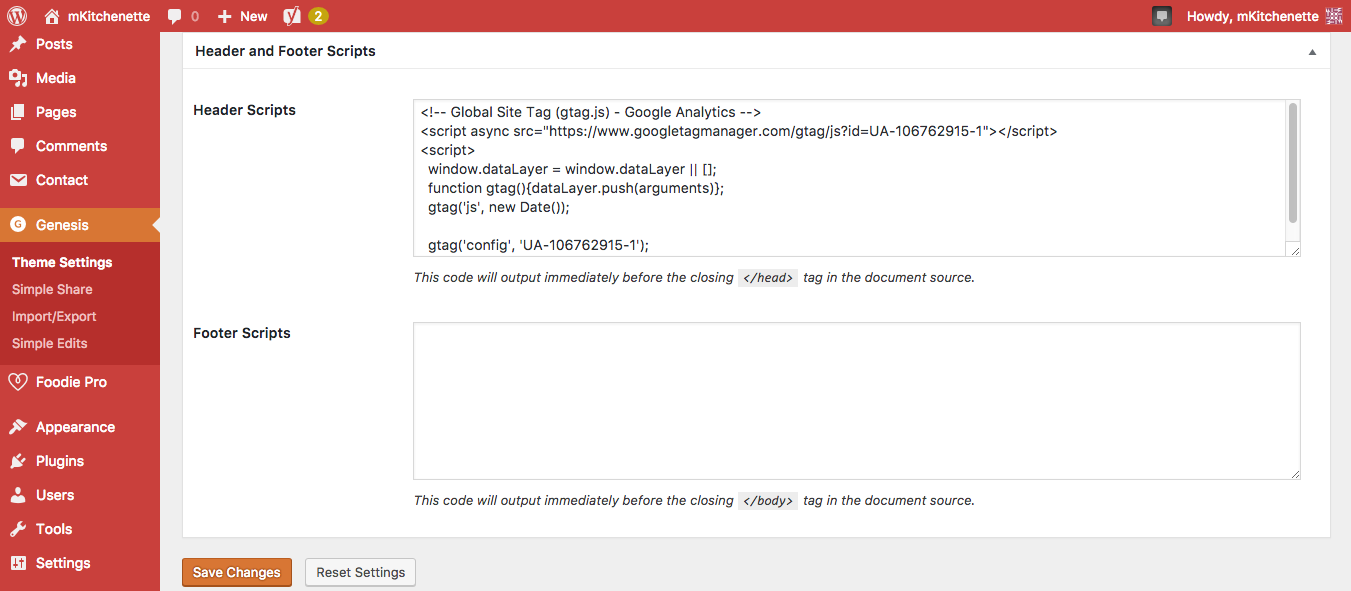 Copy-paste your Google Analytics website tracking code to your WordPress site’s header. Go to WordPress Dashboard > Genesis > Theme Settings, and paste the code into the “Header Scripts” field.