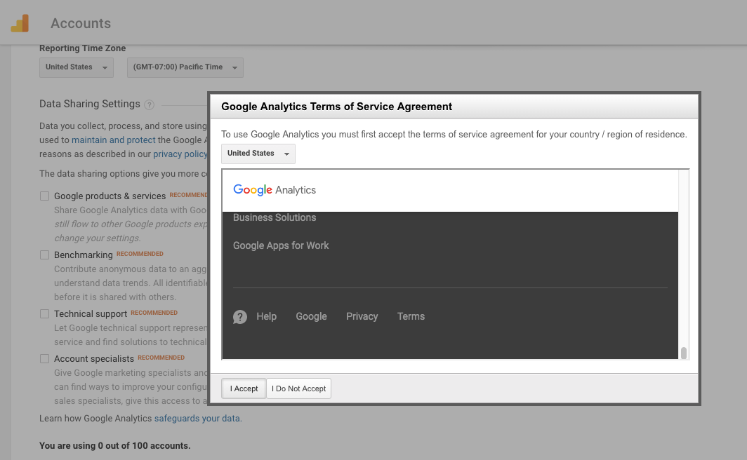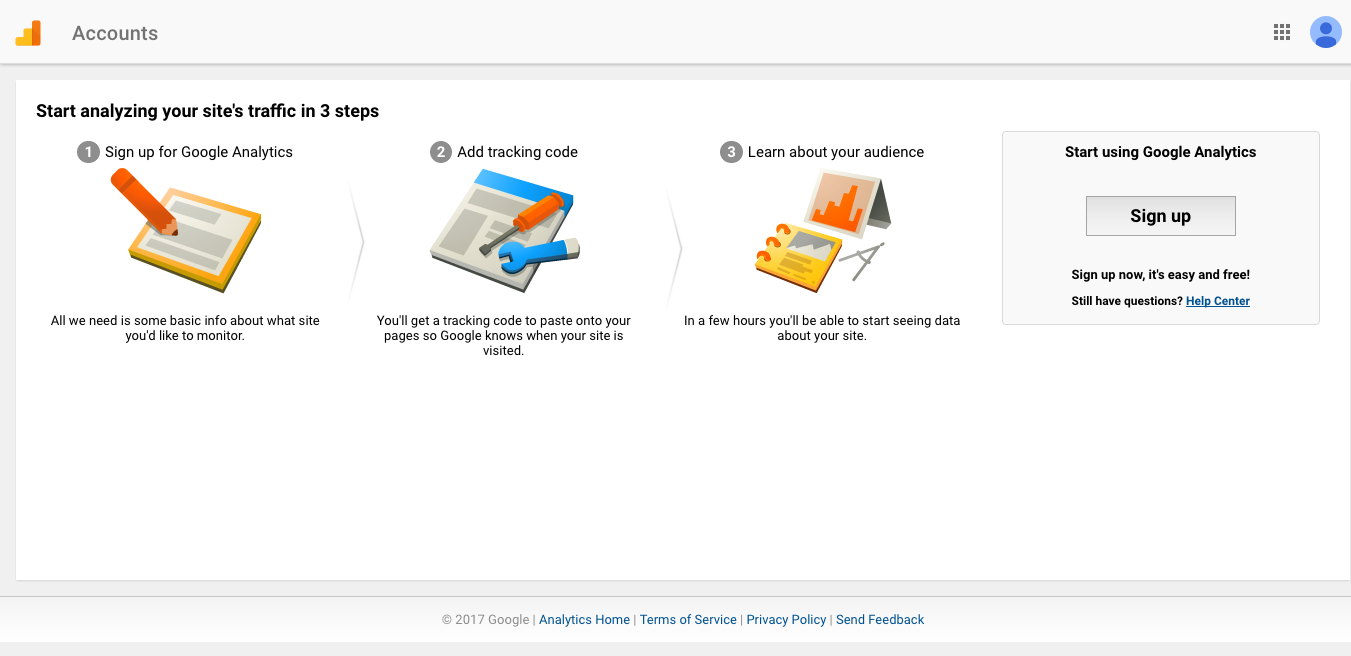 Go here https://analytics.google.com/analytics/web/ to sign up for a new Google Analytics account (using your Google/Gmail account).