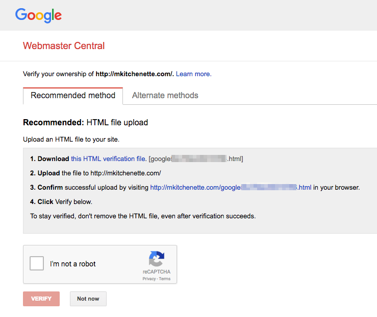The recommended way to verify your domain name is HTML file upload method as it’s a set and forget kind of method. But if you are a beginner and don’t know how to manually upload files to your server then the easiest way is HTML tag method (in Alternate methods).
