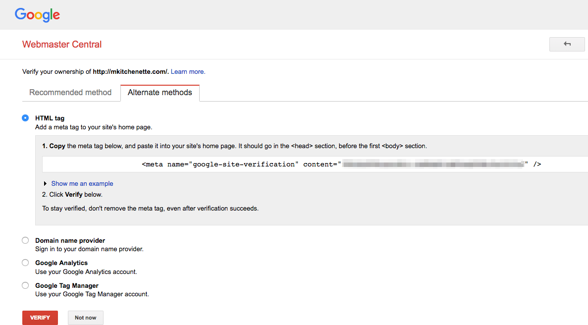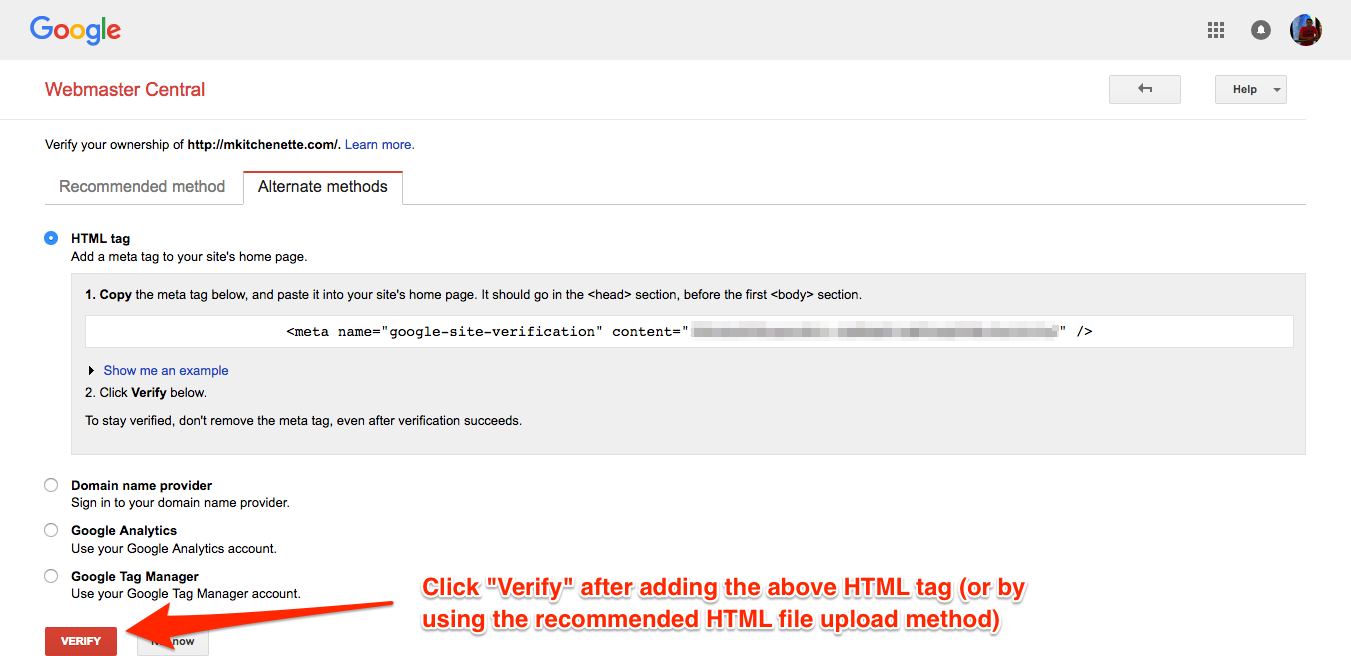 Click “Alternate methods” and select “HTML tag” from the list. It will show the verification code (in an HTML code).