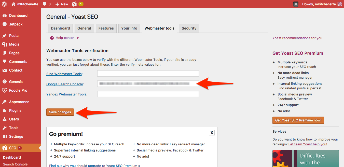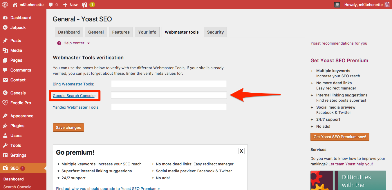 Now all you need to do is copy-paste the secret code to Yoast SEO > Dashboard > Webmaster Tools > Google Search Console field.