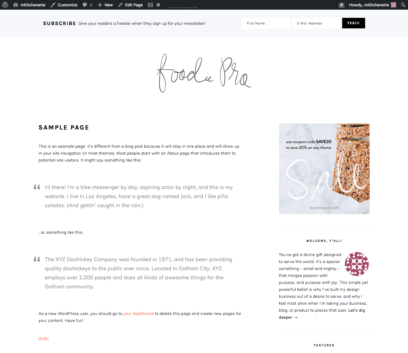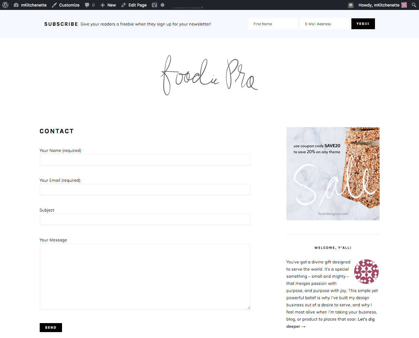 Here’s the final preview of mKitchenette (homepage, sample page, and contact page) after:
